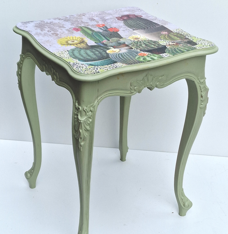 UNIKAT! Chippendaletischchen, in Grau-Grün lackiert, mit einer Gestaltung aus beigen Hintergrundpapieren als Tapetenwand, vor der auf einer grünen Tischfläche zahlreiche Blumentöpfe mit Kakteen angeordnet sind. Die Kakteenabbildungen stammen aus alten Bestimmungsbüchern mit Aquarellen. VERSAND MÖGLICH