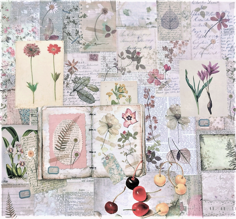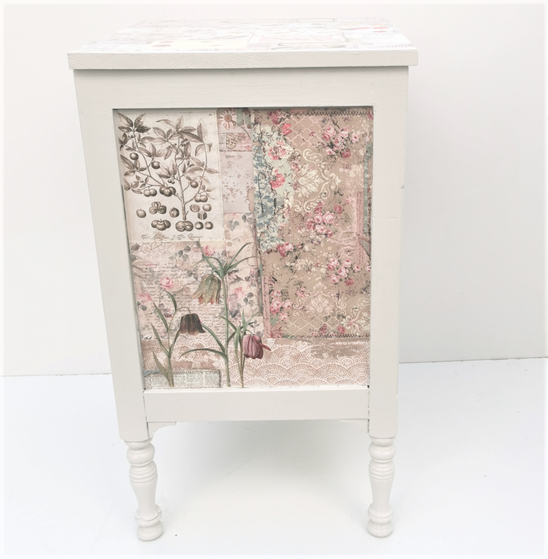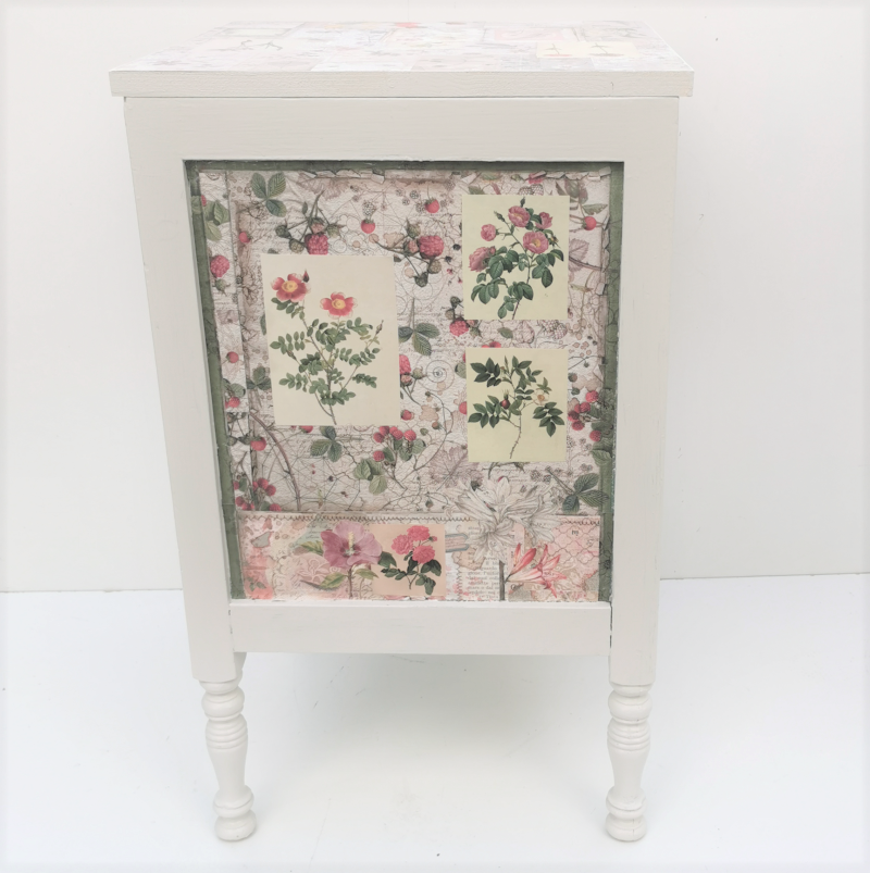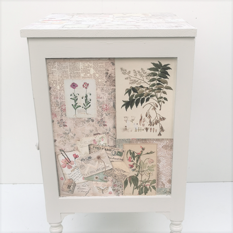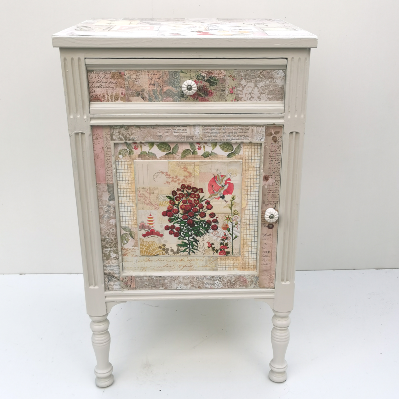 UNIKAT! Hohe Kommode mit gedrechselten Beinen, einer Schublade, einer Tür und Porzellangriffen. Die Flächen sind mit Schrift- und Musterpapieren gestaltet. Einzelne Blumenabbildungen vervollständigen die Gestaltung. Auf der Deckplatte: Papiere mit Abbildungen von getrockneten Blüten, botanischen Darstellungen und eine Hand voll Kirschen mit Tromp l'oeil Effekt. VERSAND MÖGLICH.