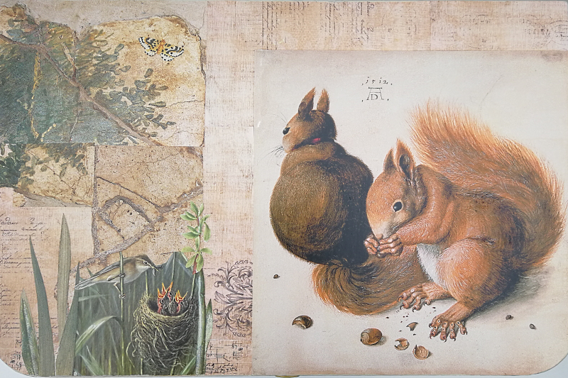 UNIKAT! Niedrige Kommode mit geschwungenen Beinen, einer Schublade, einer Tür und Metallgriffen. Zwei Eichhörnchen von Albrecht Dürer sitzen in einer Freskenlandschaft auf der Deckplatte; auf Tür und Seitenflächen sitzen Tiere auf einem Hintergrund aus Fresken. VERSAND MÖGLICH.