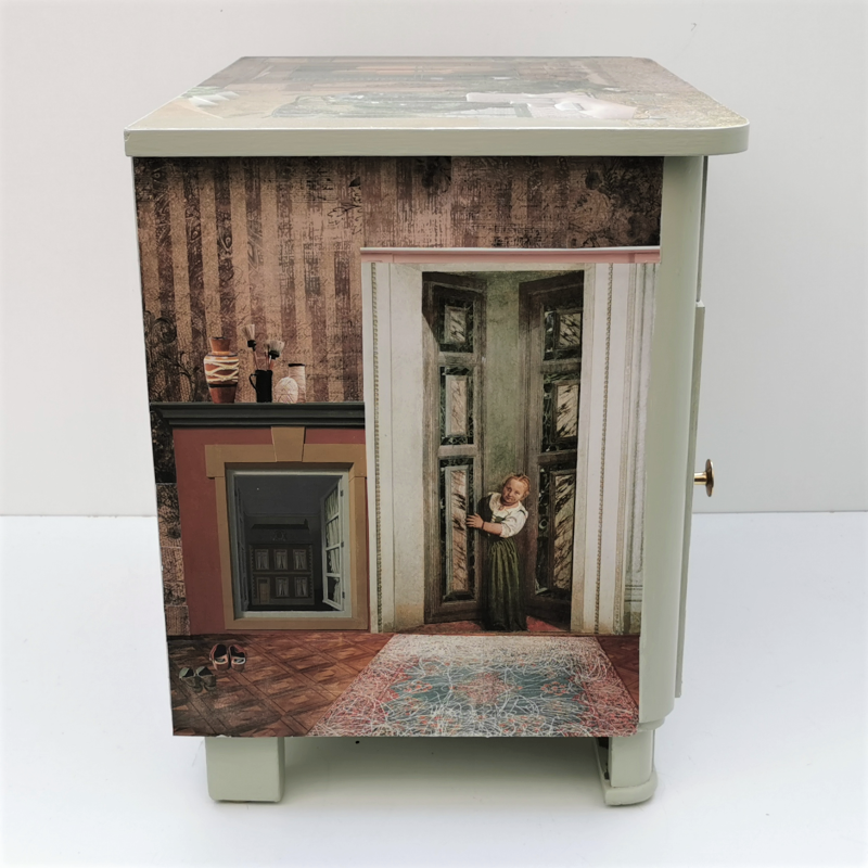 UNIKAT! Niedrige Kommode mit Fußleiste, Tür, Schublade und Metallgriffen. Der Blick fällt in Innenräume, bei denen hauptsächlich Motive von Magritte in Fensterausschnitten, in einem Kleiderschrank und einem Sideboard eine Rahmung erfahren. Außer einem Renaissancemädchen in einem Tromp l'oeil Bild auf der linken Seite sind keine Menschen zu sehen. VERSAND MÖGLICH.