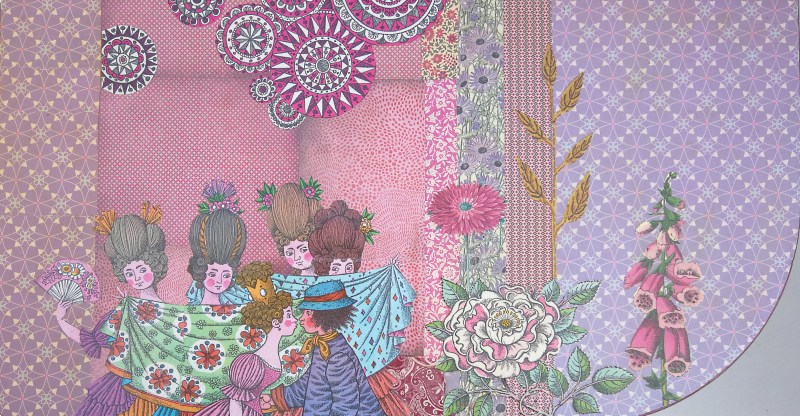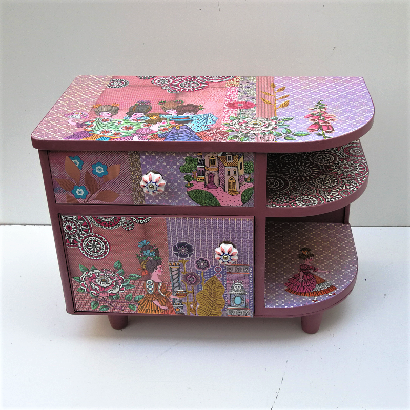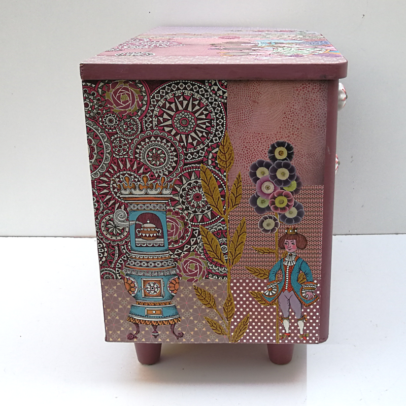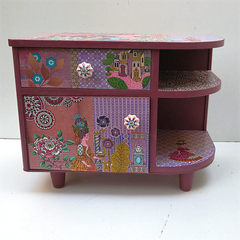 UNIKAT! Niedrige Kommode mit einer Schublade, einer Tür, Porzellangriffen und zwei offenen Fächern. Die Basis der Gestaltung ist ein altes DDR Märchenbuch. Auf pink/rosenrot/lila Musterpapieren sind Ausschnitte mit Abbildung der Prinzessin mit ihrem Hofstaat, des Schweinehirten und des Schlosses angeordnet. VERSAND MÖGLICH.