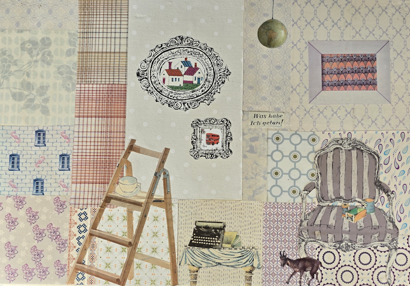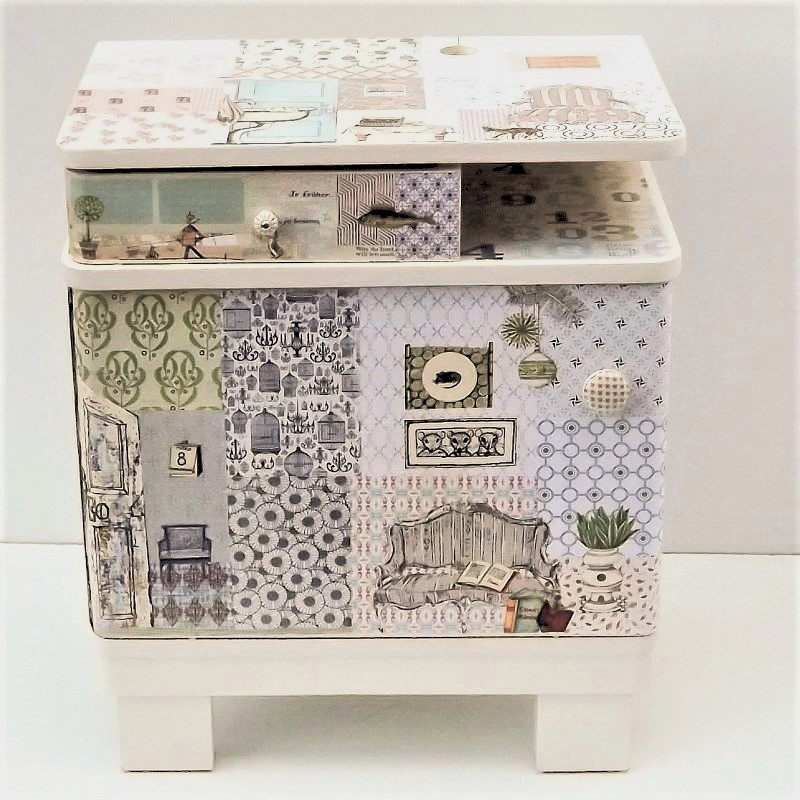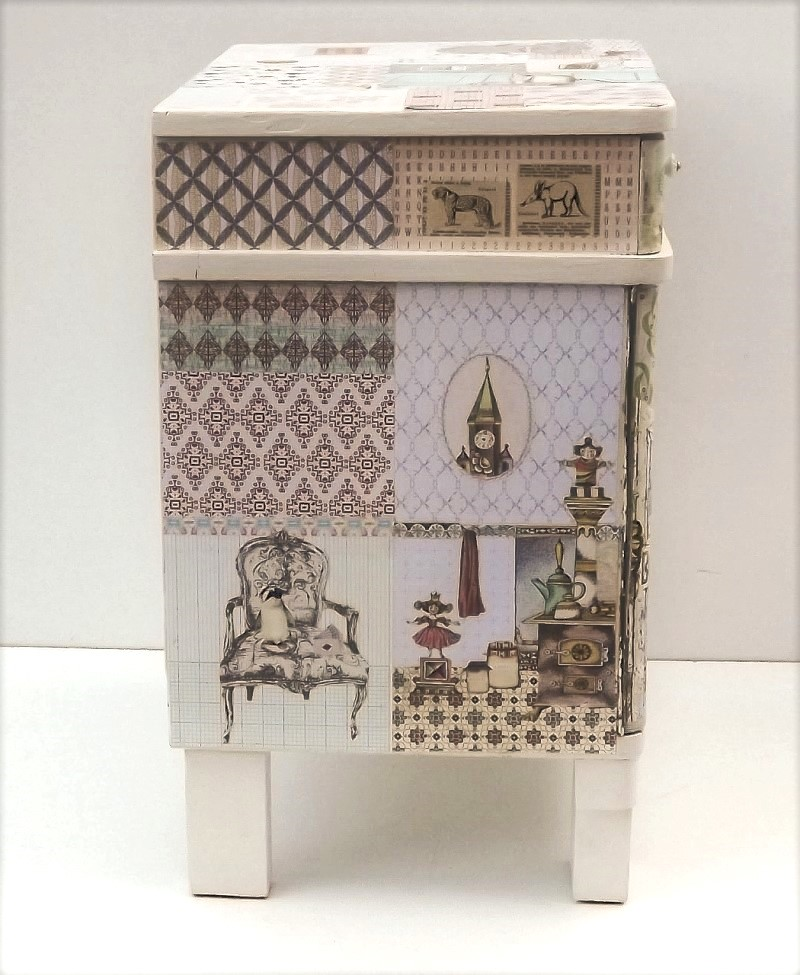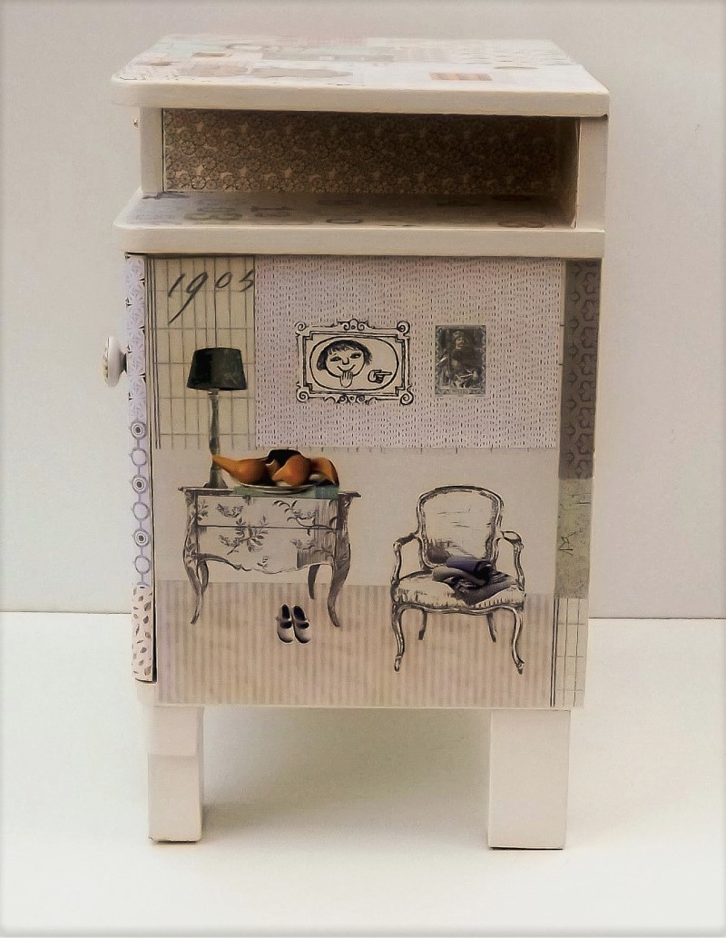 UNIKAT! Kommode mit einer Tür, einem Seitenfach und einr Schublade. Die Flächen sind vornehmlich mit graphischen Mustern auf weißem Grund gestaltet. Die Bildelemente stammen aus alten Kinderbüchern und Ausschnitten aus einer englischen Papiertapete mit Sesseln und Sofas. Die Kommode eignet sich auch für ein Kinderzimmer. VERSAND MÖGLICH.