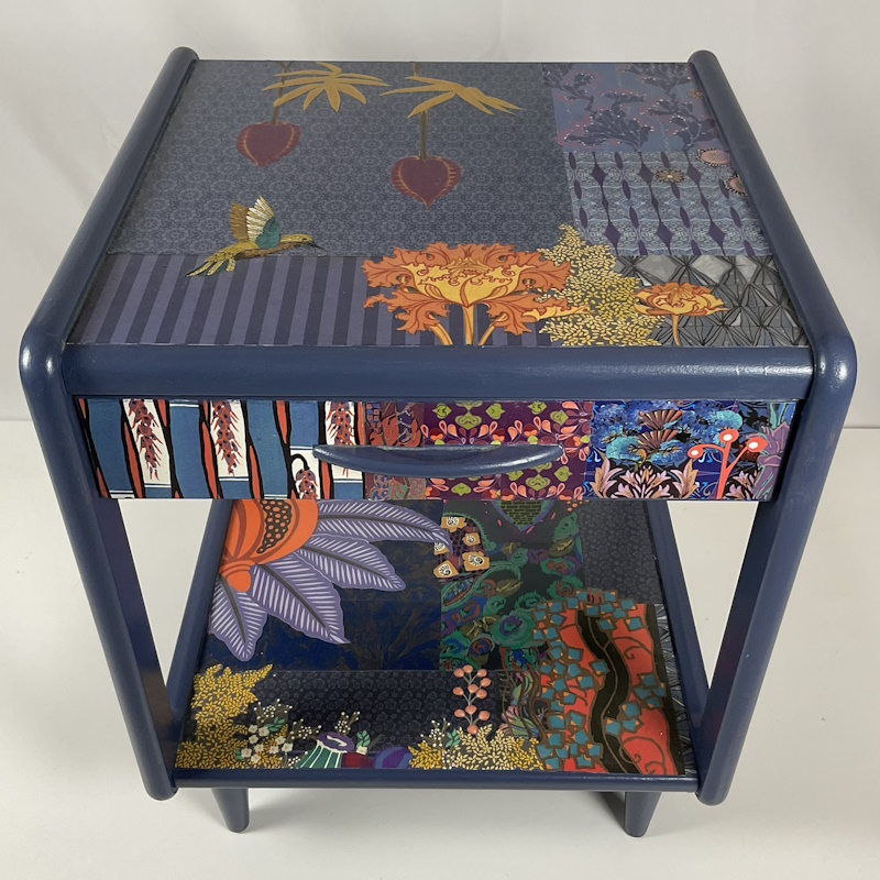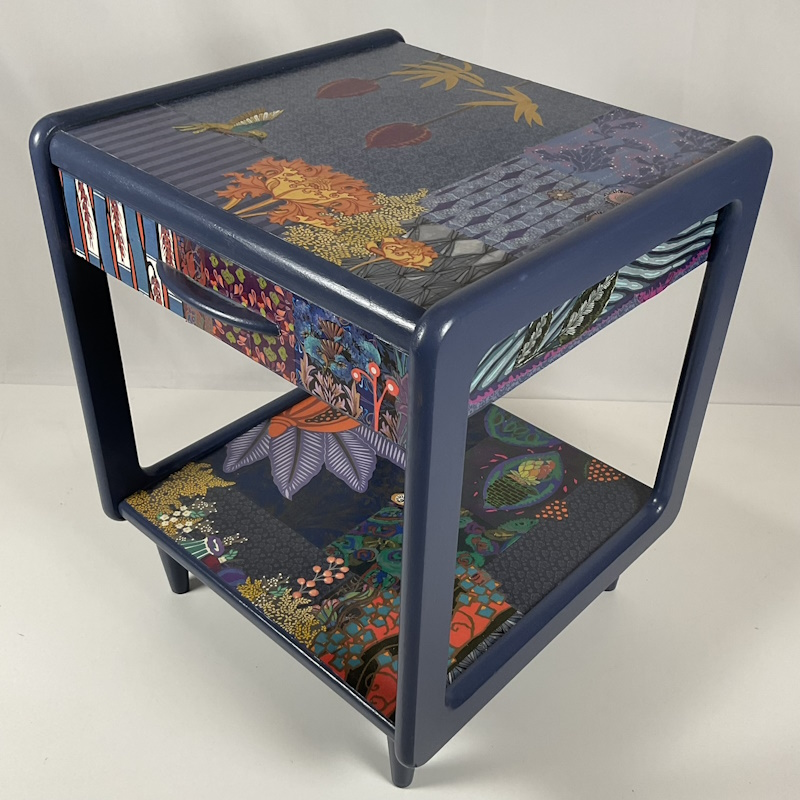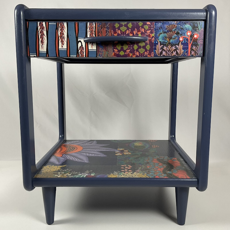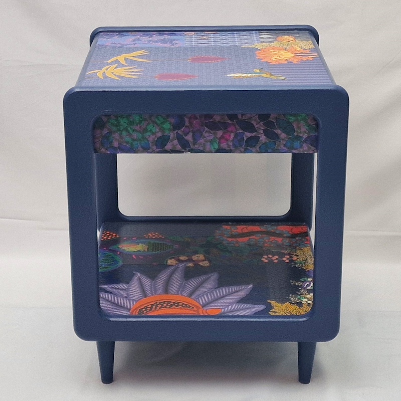 UNIKAT! Niedrige Kommode auf hohen Beinen mit einer Schublade und einem offenen Fach. Die Gestaltung basiert auf Ausschnitten aus Art Deco Entwürfen in starken Farben auf einem dunkellila Untergrund. VERSAND MÖGLICH.