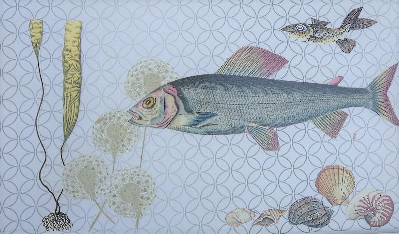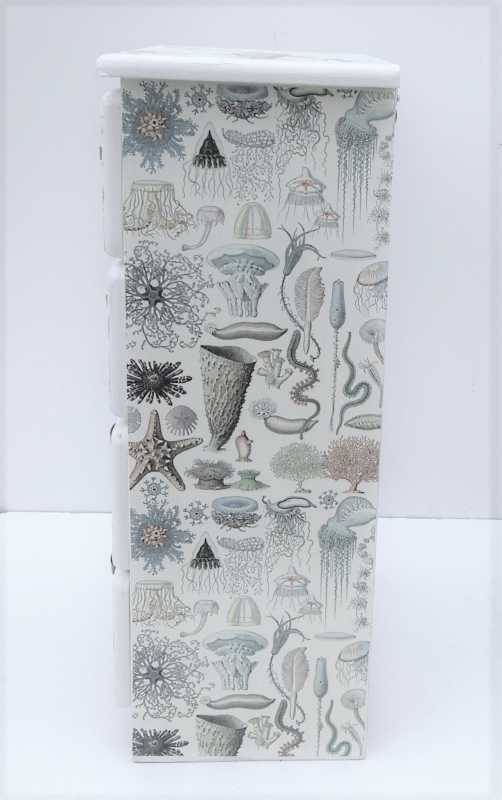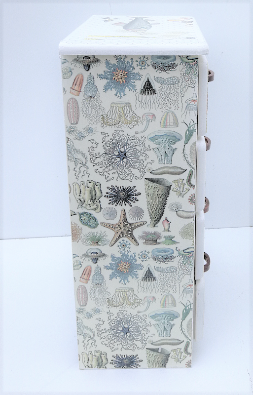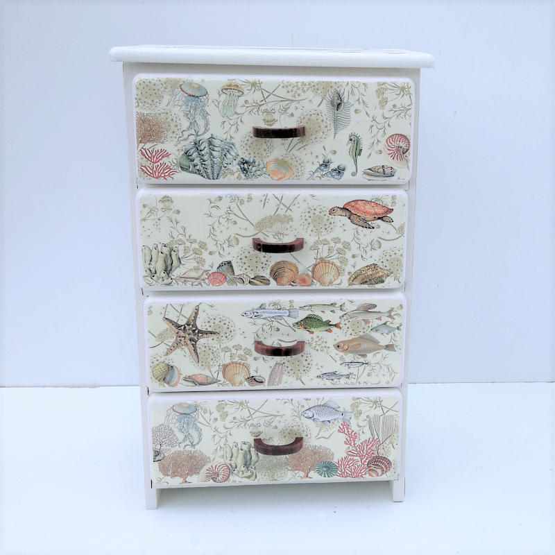 UNIKAT! Niedrige Schubladenkommode mit vier Schubladen und Horngriffen. Die Seitenflächen sind mit einem weißgrundigen Künstlerpapier mit Muscheln gestaltet, die Schubladen zeigen Muscheln, Seesterne und Fische in einem Korallenriff; auf der Deckplatte schwimmt ein großer Fisch mit kleinen Gefährten auf einem Musterpapier. Die Kommode kann auch als Hängeschränkchen verwendet werden, die hatte hierfür Befestigungen. VERSAND MÖGLICH.