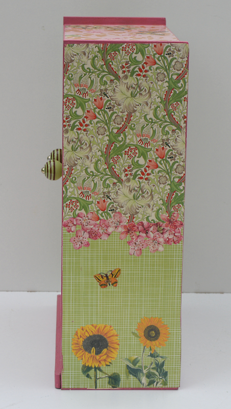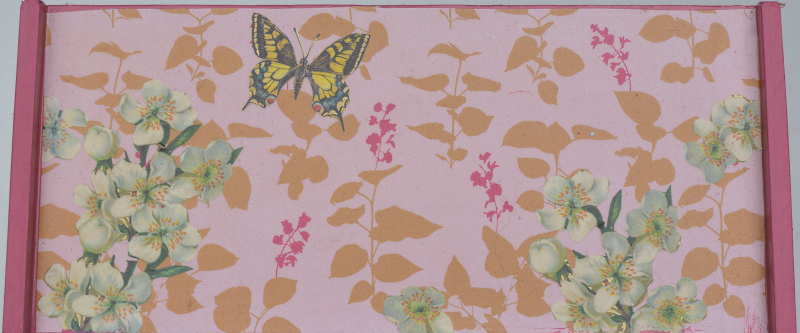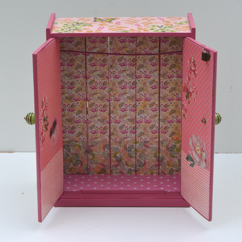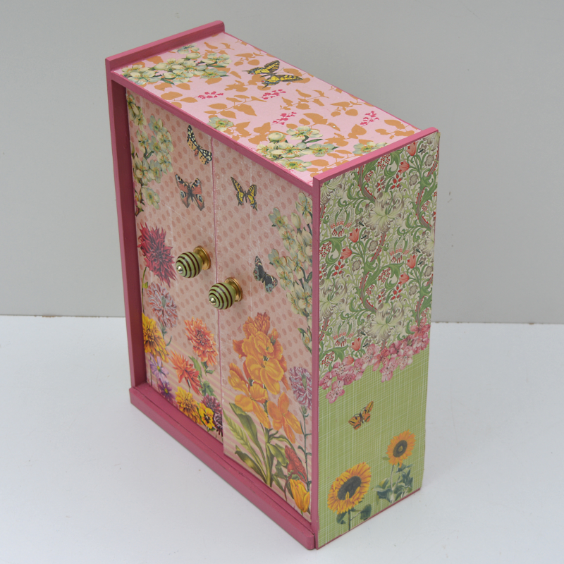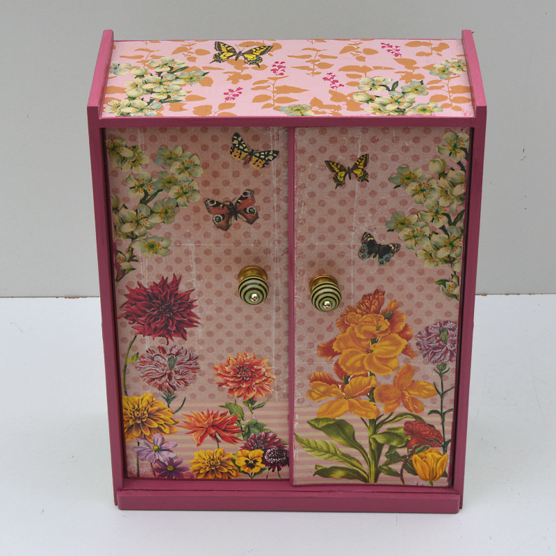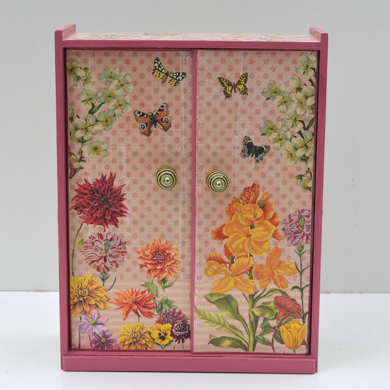 UNIKAT! Puppenschrank mit zwei Türen, Porzellangriffen und im Innern einer Kleiderstange. Die Flächen sind mit gepunktetem und gemustertem Papier bezogen. Auf den Türen sieht man ein Blumenbeet mit Schmetterlingen. Auf den Seiten ranken Blüten. VERSAND MÖGLICH.