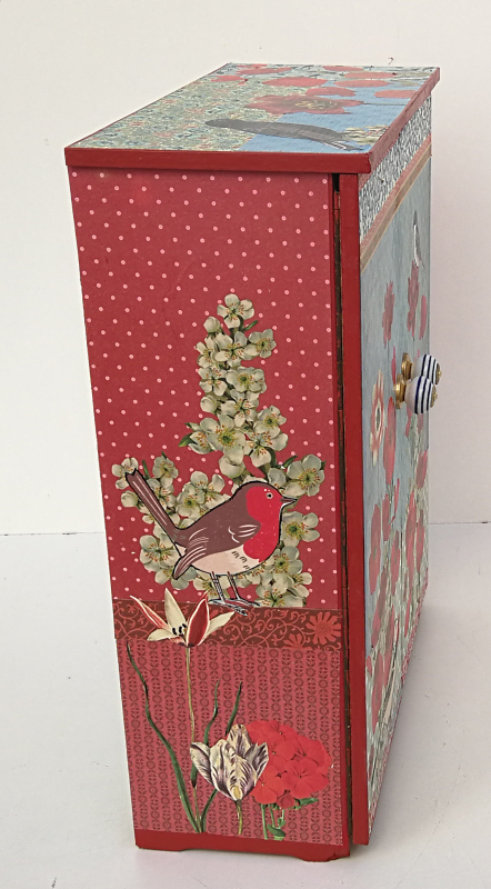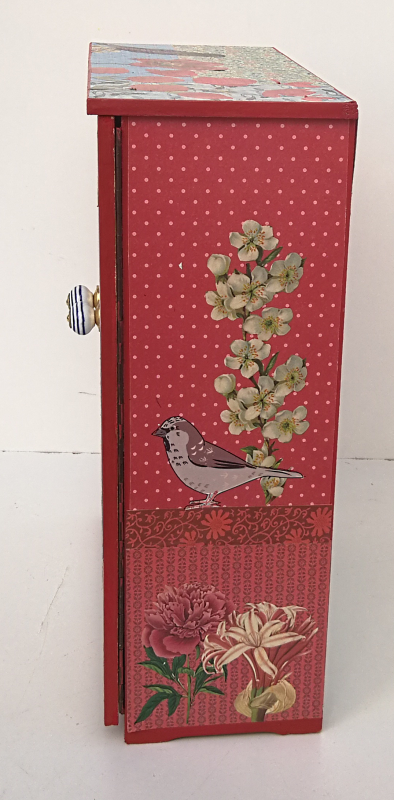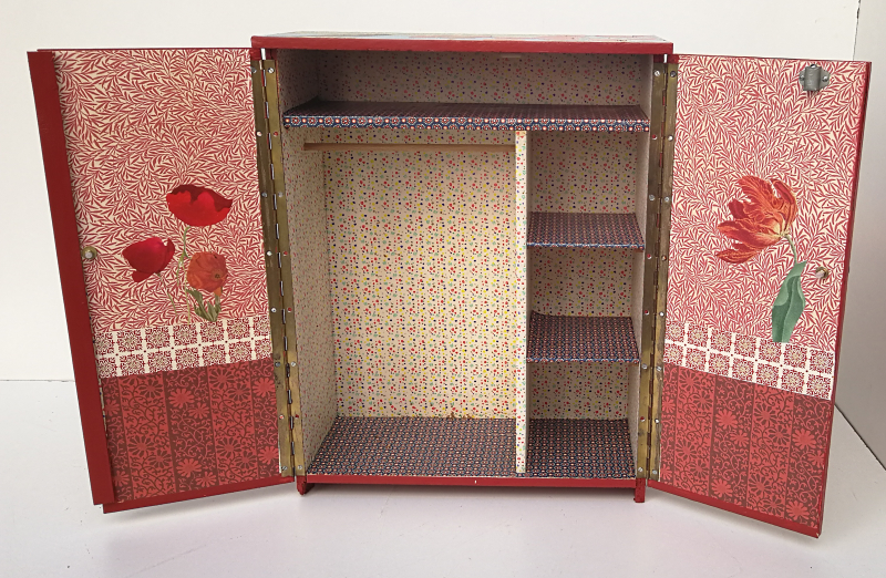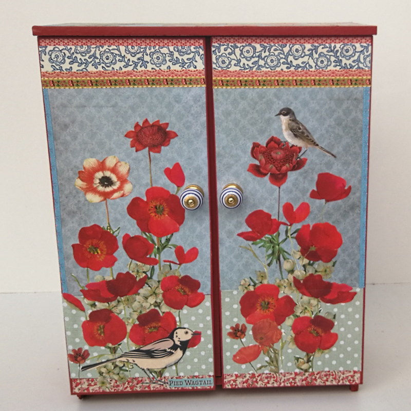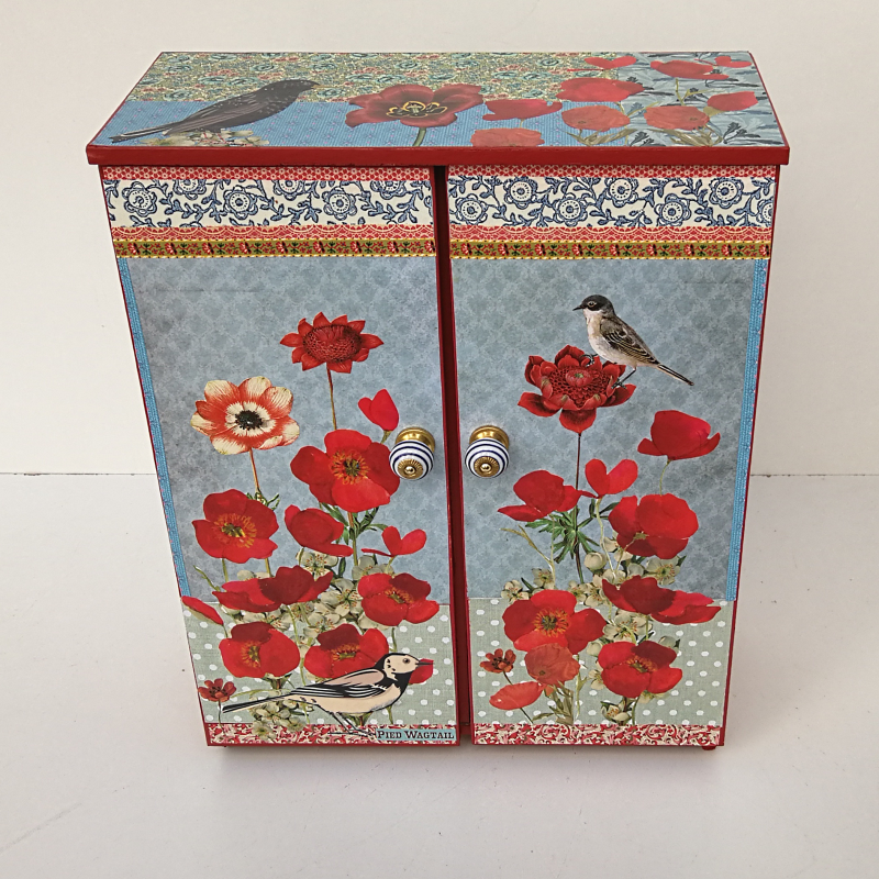 UNIKAT! Puppenschrank mit drei Regalbrettern, einer Kleiderstange, einem durchgehenden Regalbrett und Porzellangriffen. Auf den Türen blühen Mohnblumen in voller Pracht. Auf den Türen, der Deckplatte und den Seitenflächen sitzen Vögel zwischen Blumen. VERSAND MÖGLICH.