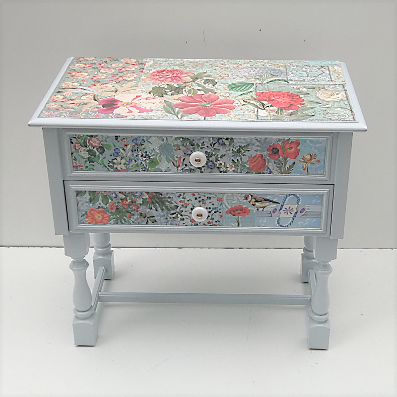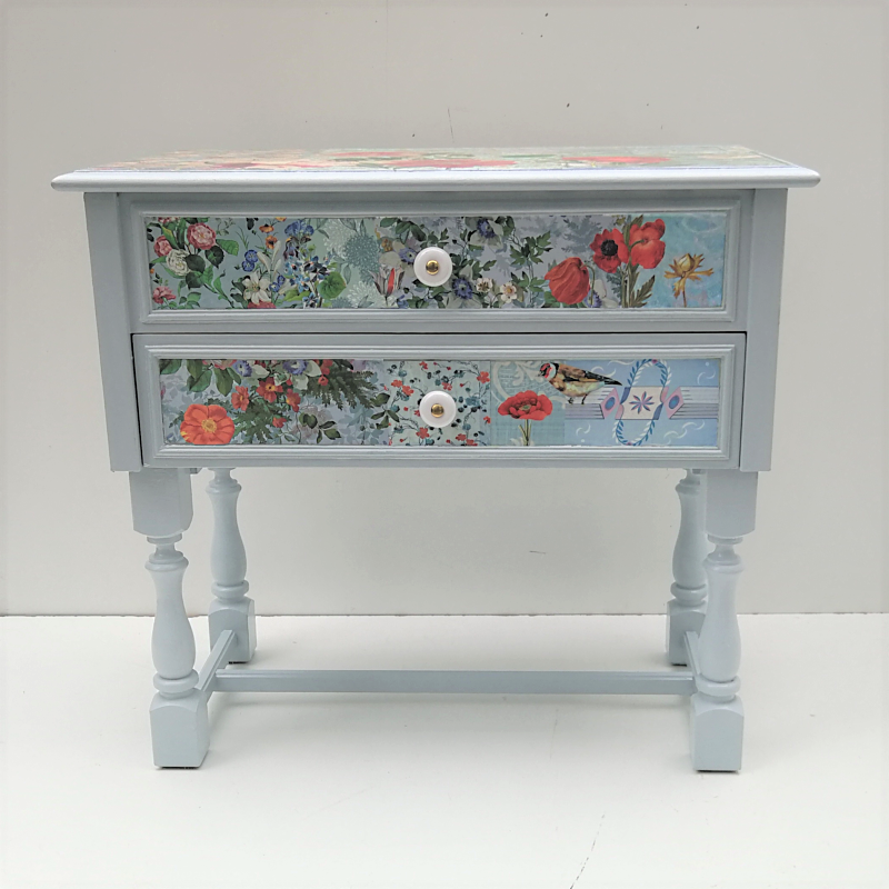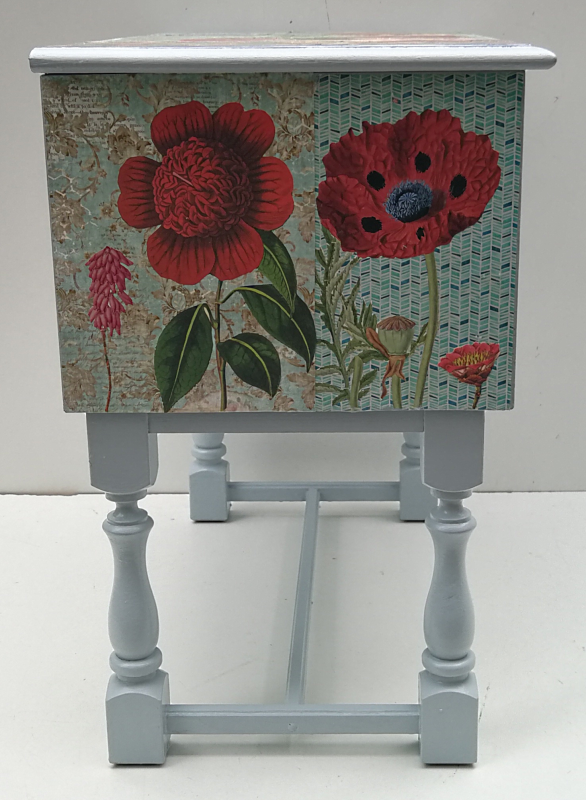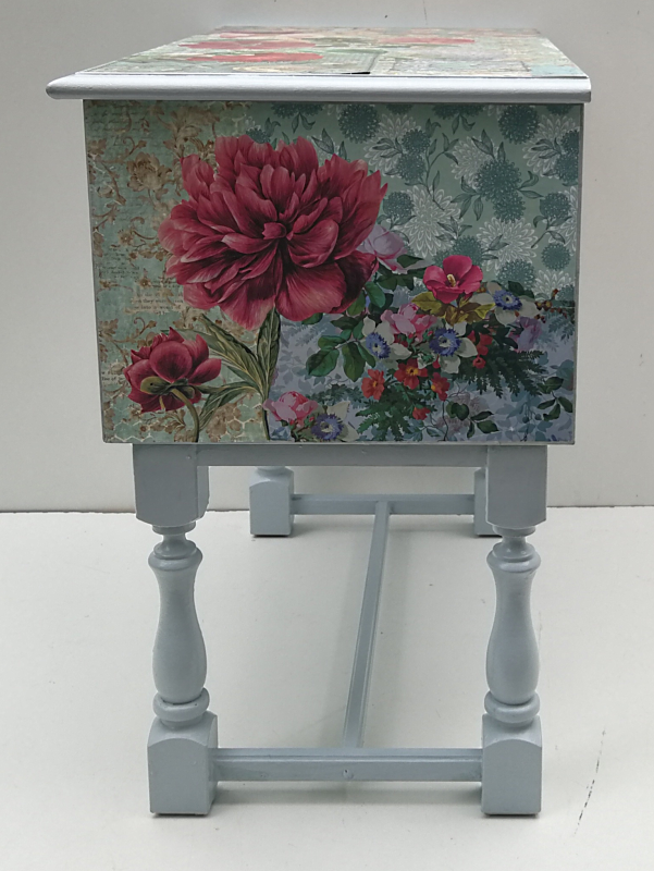 UNIKAT! Niedrige Kommode mit gedrechselten Beinen, einer Schublade und einem aufklappbaren Fach. Es handelt sich hierbei um einen Tisch, der ursprünglich für Nähutensilien gedacht ist. Die Flächen sind mit romantischen Blumenabbildungen, einem Vogel und Hintergrundpapieren gestaltet. Auf dem zartfarbigen Hintergrund blühen Pfingstrosen und andere rote Blumen. VERSAND MÖGLICH.