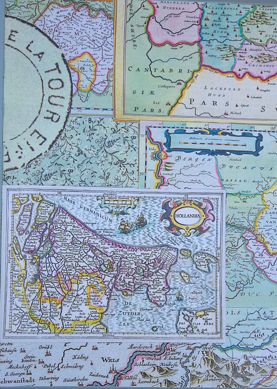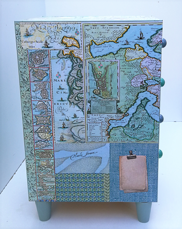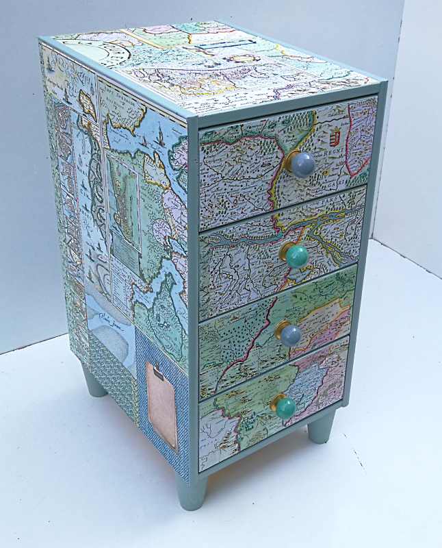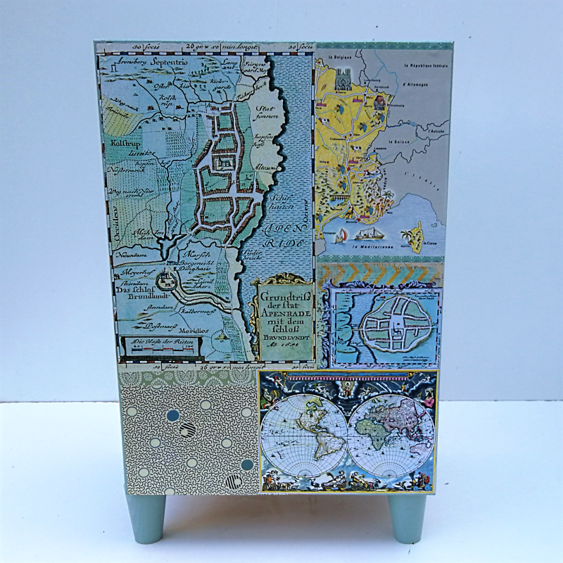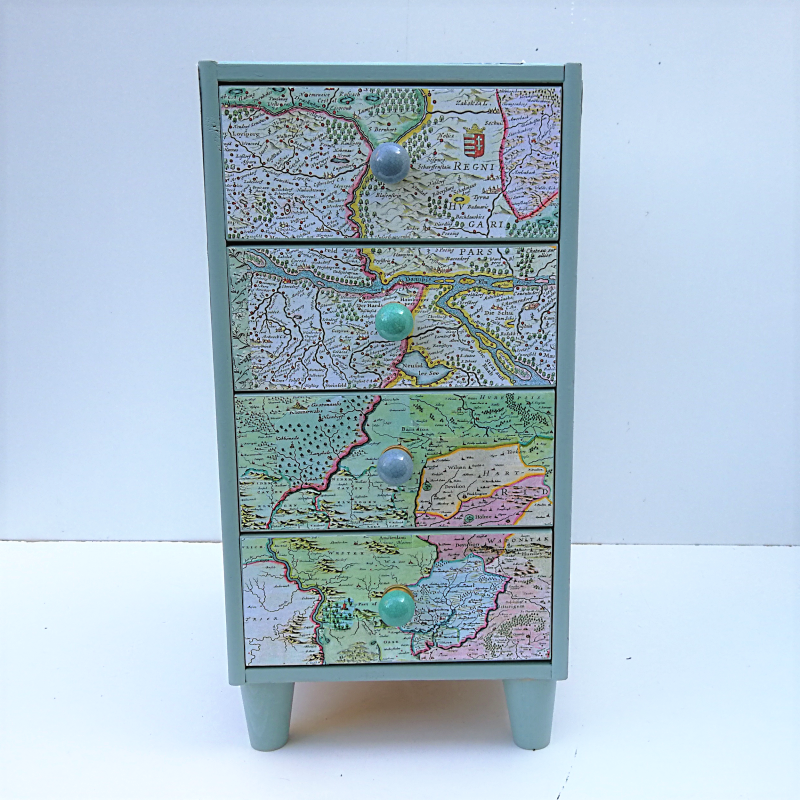 UNIKAT! Schmale Schubladenkommode aus Holz mit vier Schubladen, runden Porzellangriffen und hohen Möbelfüßen. Die kleine Kommode ist gestaltet mit Ausschnitten aus Reproduktionen alter Atlanten. Die alten Landkarten sind neue Verbindungen eingegangen. Was auf den ersten Blick wie komplette Landkarten auf den Schubladen aussieht, besteht aus einer Vielzahl von Ausschnitten aus den historischen Landkarten, die sich zu neuen Karten zusammenfügen. Die kleine Kommode eignet sich als Schreibtischunterschrank für Weltenbummler. VERSAND MÖGLICH.