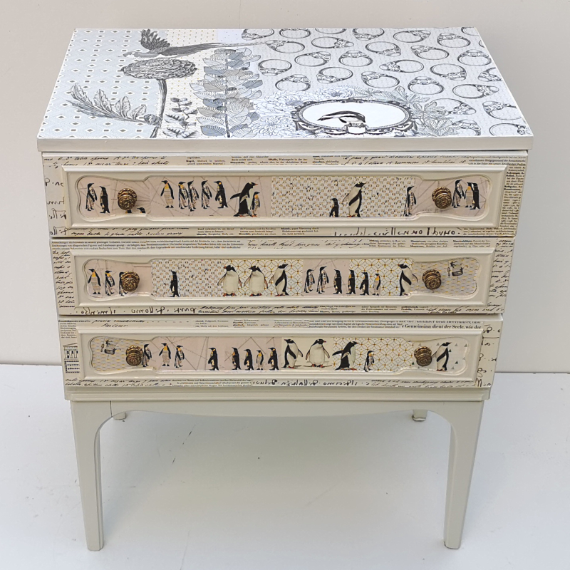 UNIKAT! Kleine Schubladenkommode mit 6 Schubladen und Metallgriffen. Die Gestaltung besteht aus Abbildungen aus einem Übungsbuch um 1950, in dem Details aus dem Metallbau abgebildet sind.