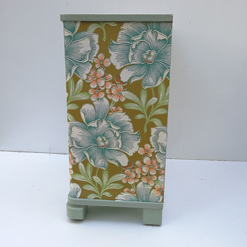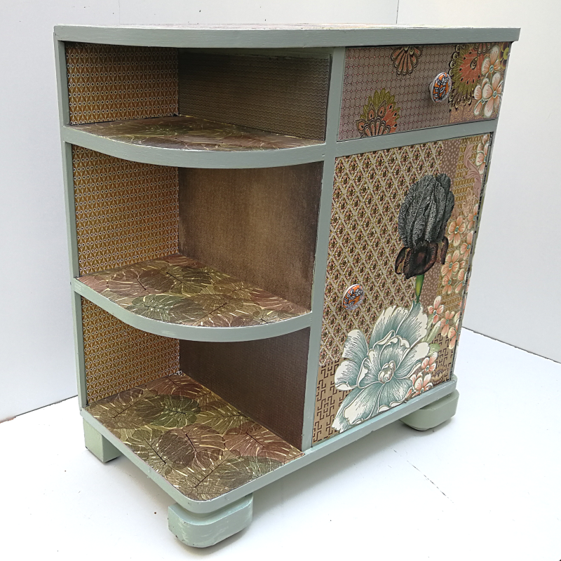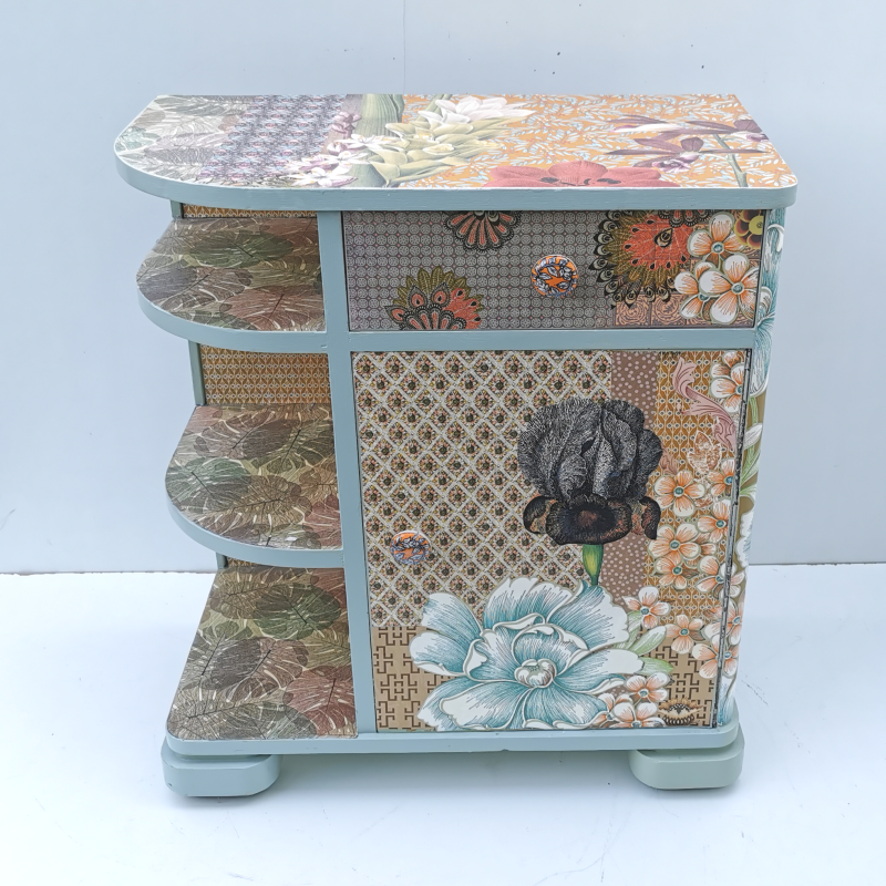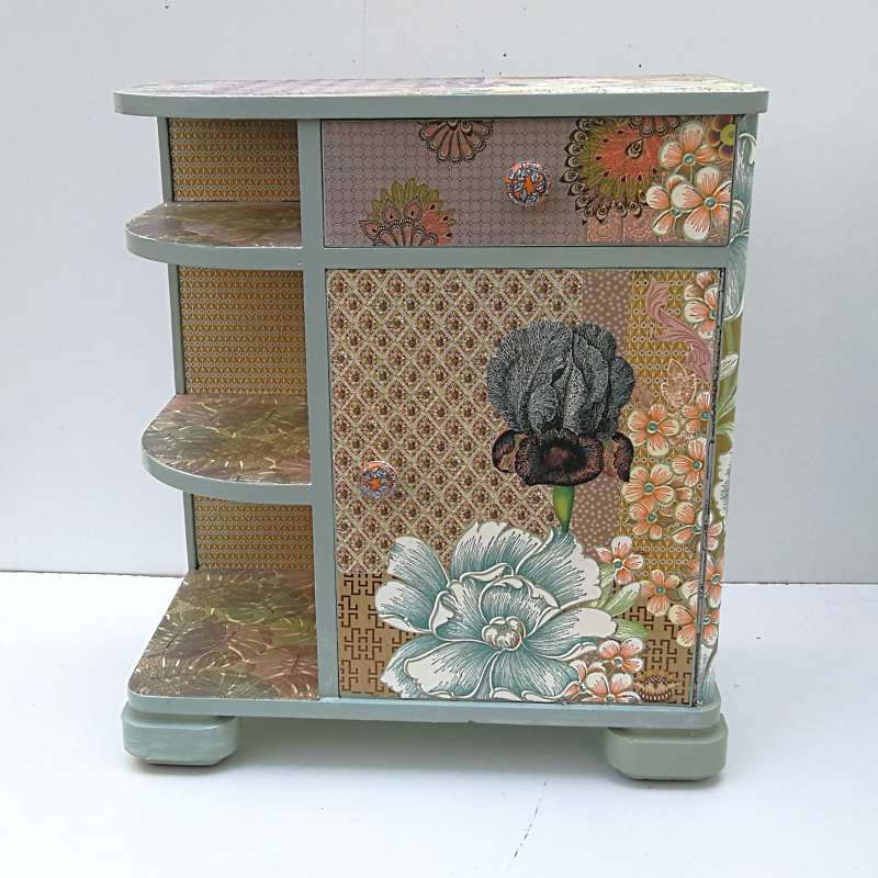 UNIKAT! Kleiner Schrank mit drei offenen Fächern, einer Schublade, einer Tür und Porzellangriffen. Der Schank ist gestaltet mit einer Original-Blumentapete aus den 60er Jahren auf der rechten Seite, einem englischen Musterpapier in den Seitenfächern und Ausschnitten aus verschiedenen Tapeten und Papieren mit graphischen Mustern auf den übrigen Flächen. Es entstand ein stilisiertes Gartenstück auf Tür und Deckplatte. KEIN VERSAND. Bitte nachfragen, ob eine Anlieferung innerhalb Deutschlands möglich ist oder Spedition beauftragen.
