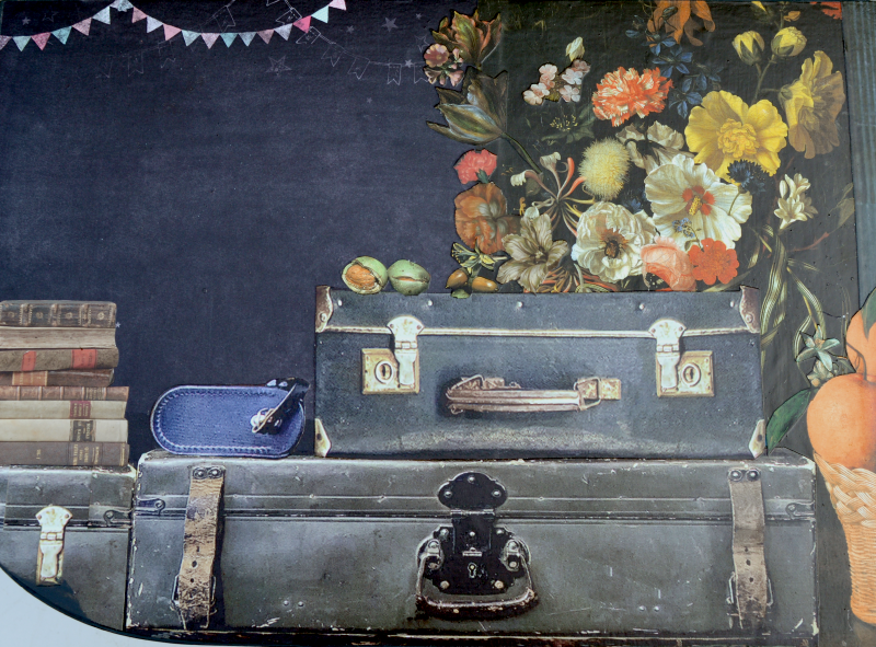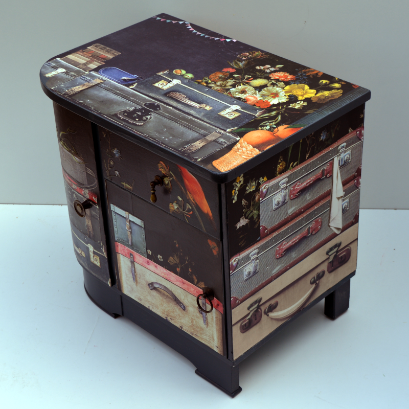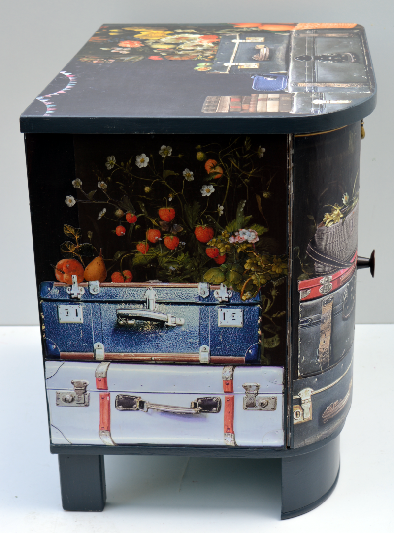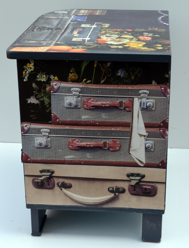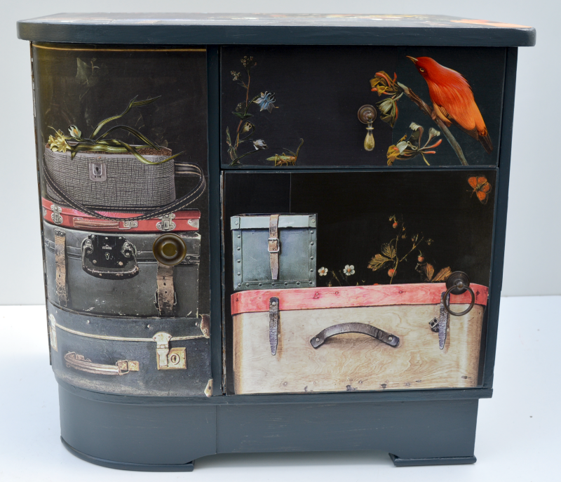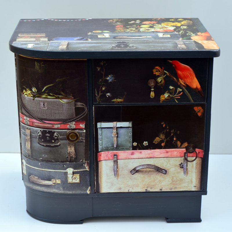 UNIKAT! Niedrige Kommode mit einer Schublade und zwei Fächern. Die beiden Türen und die Schublade haben unterschiedliche Metallgriffe. Vor einem Hintergrund aus Reproduktionen von alten Blumengemälden stapeln sich alte Koffer. Auf der Schublade begrüßt ein roter Vogel den Reisenden. VERSAND MÖGLICH. Bei Kauf mit Versand lesen Sie bitte die Hinweise auf der Startseite.